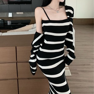 太ボーダーリブカーディガン+キャミワンピース セット C0455