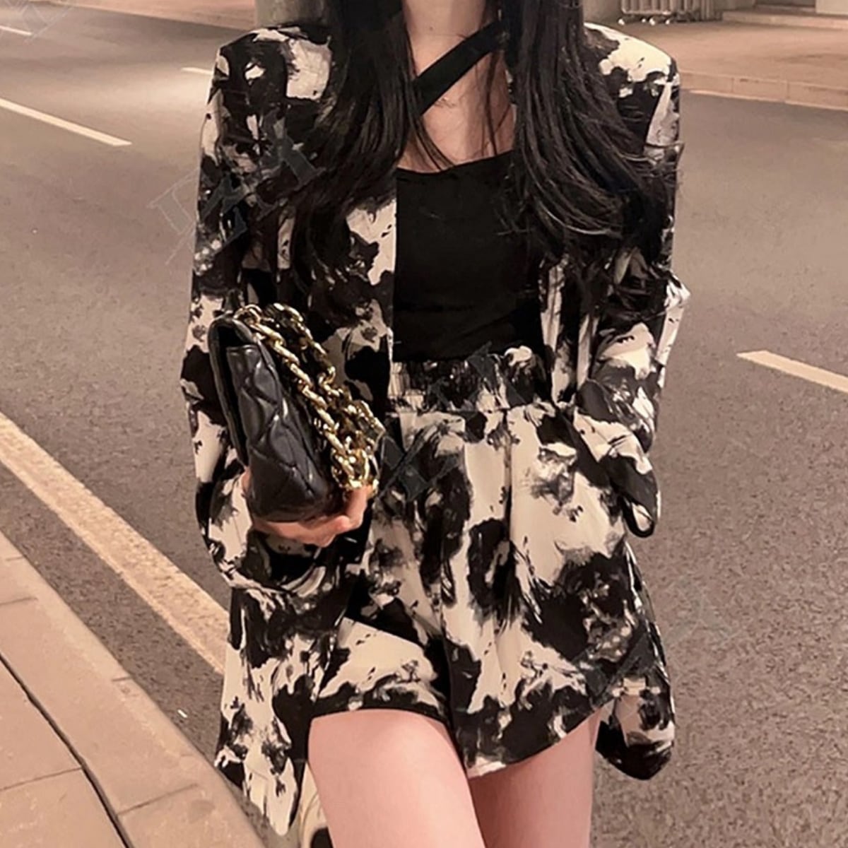 ウォーターフラワー柄が目を引くジャケット×ショートパンツのセットアップ