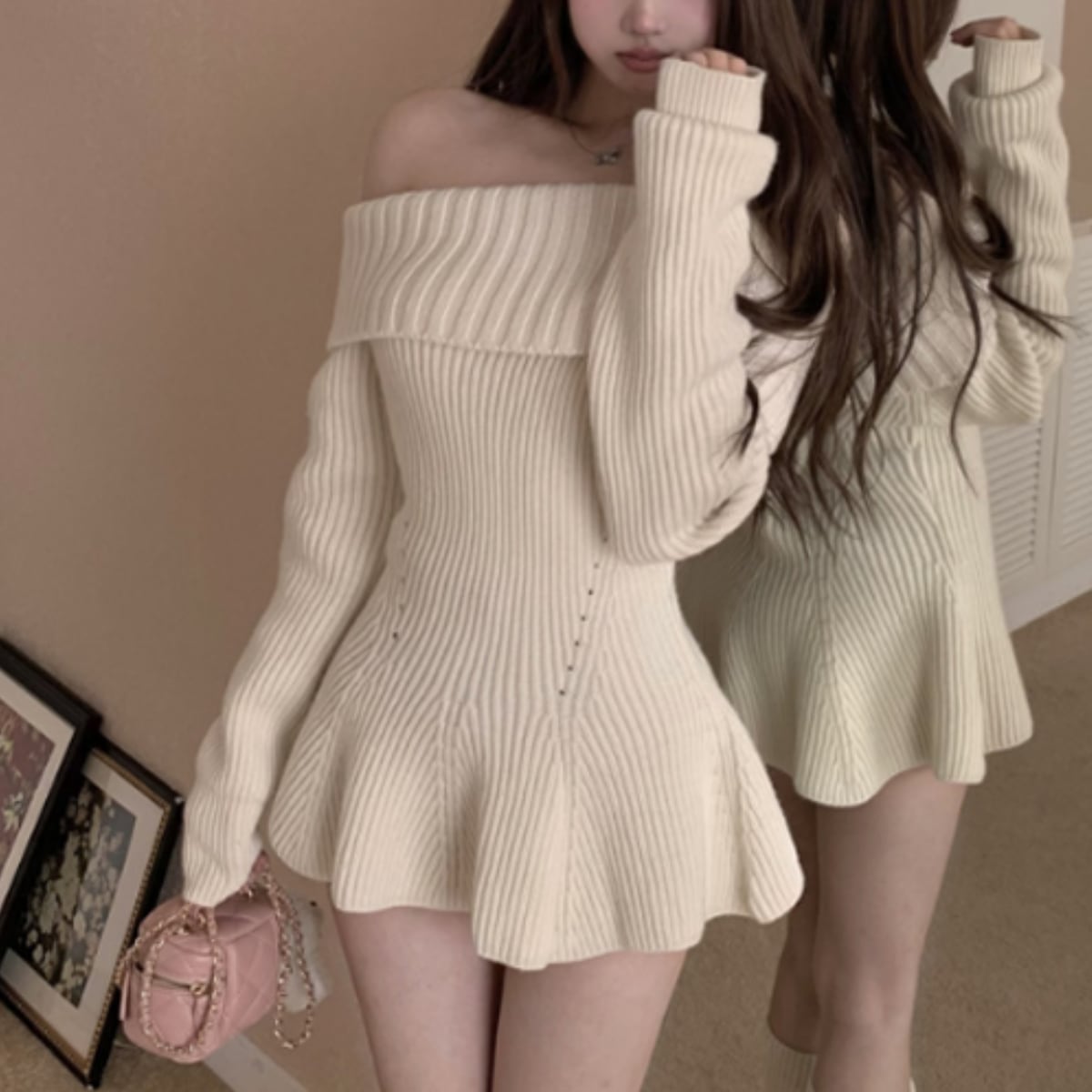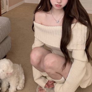 オフショルフレアニットワンピース C0369